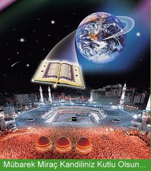 Miraç kandiliniz kutlu olsun.![]() Kulu Muhammed'i bir gece Mescid-i Haram'dan (Kâbe'den) yola çıkararak kendisine bazı mucizelerimizi gösterelim diye çevresini kutsal kıldığımız Mescid-i Aksa'ya (Kudüs'e) ulaştıran Allah her türlü noksanlıktan uzaktır. O her şeyi işiten ve görendir.(İsra-1)